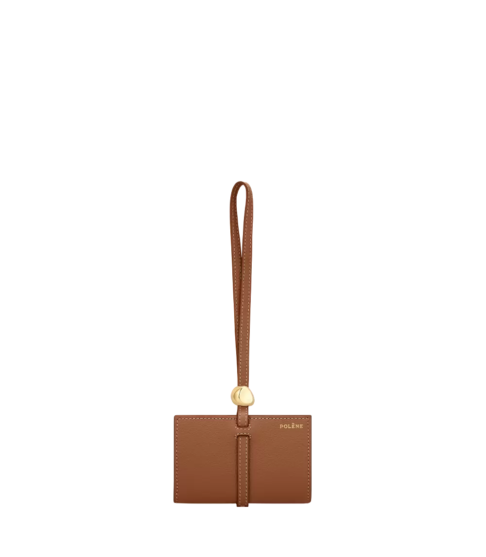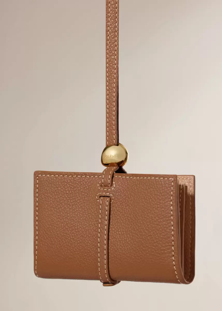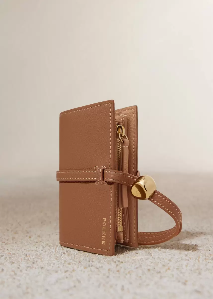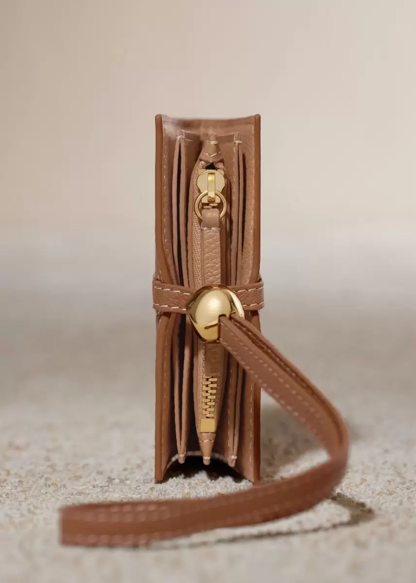 The Kayé Card Holder features three expandable compartments, giving it the appearance of a small book. Bound together by a leather strap, it closes with a sliding gold-plated pebble and can be worn on the wrist.