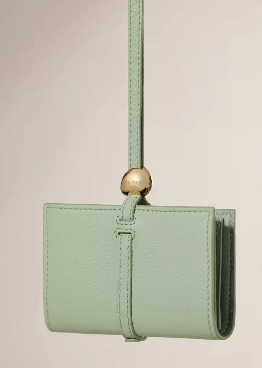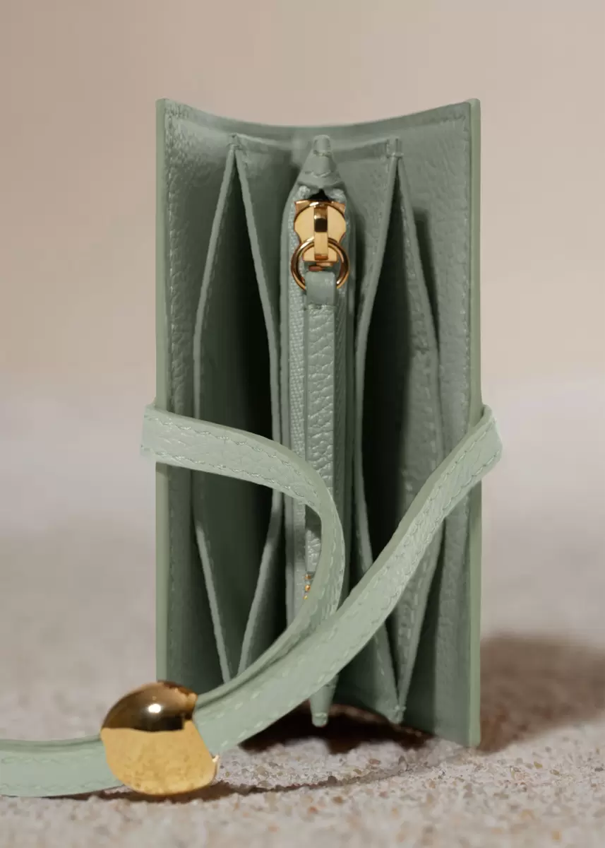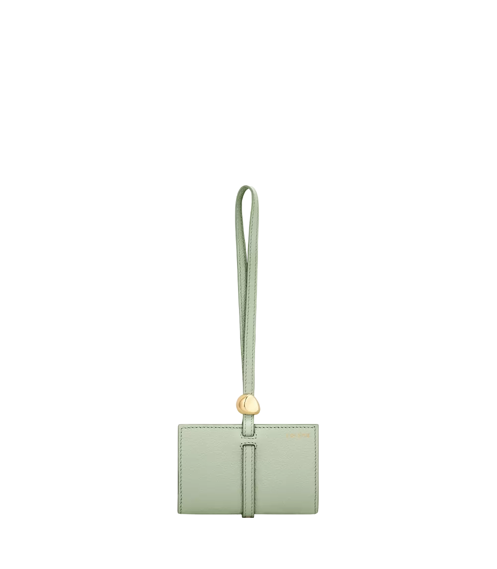 The Kayé Card Holder features three expandable compartments, giving it the appearance of a small book. Bound together by a leather strap, it closes with a sliding gold-plated pebble and can be worn on the wrist.