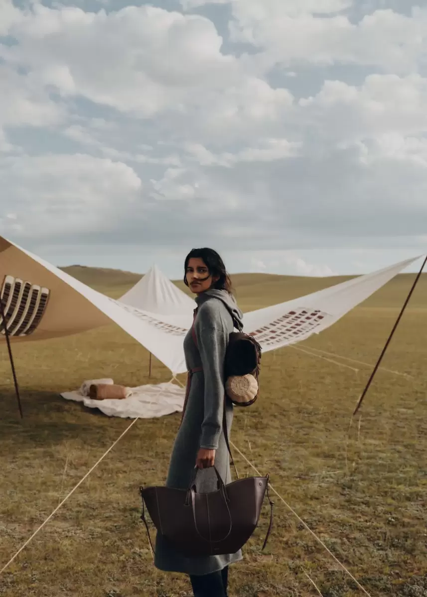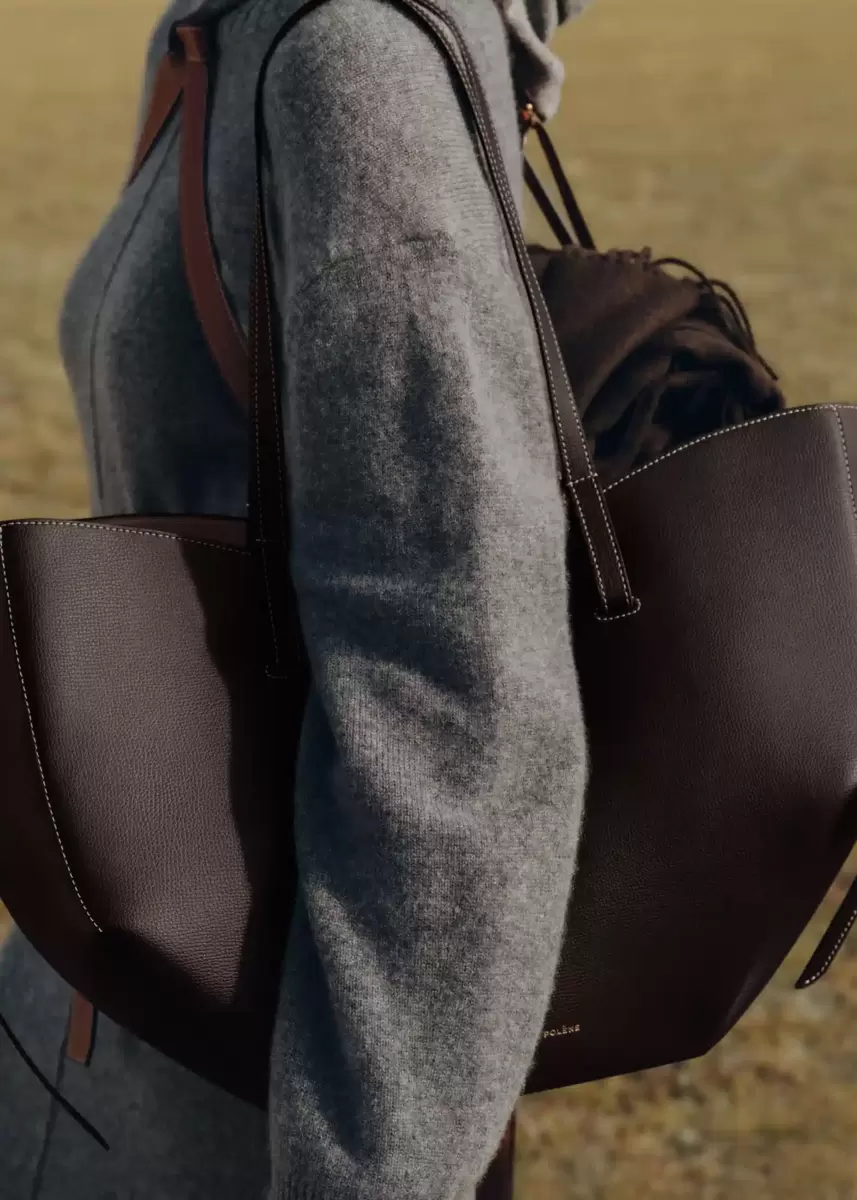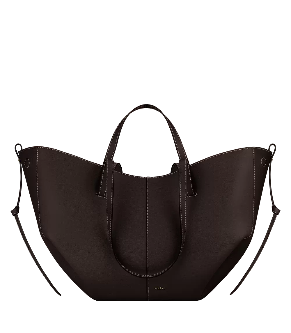This sculptured tote bag featuring waves, folds, and curves can be used in two ways. Basket-style, with its sides open and straps on the outside, or As a flower-like closed bag, with its sides tucked in and its straps crossed on the inside.