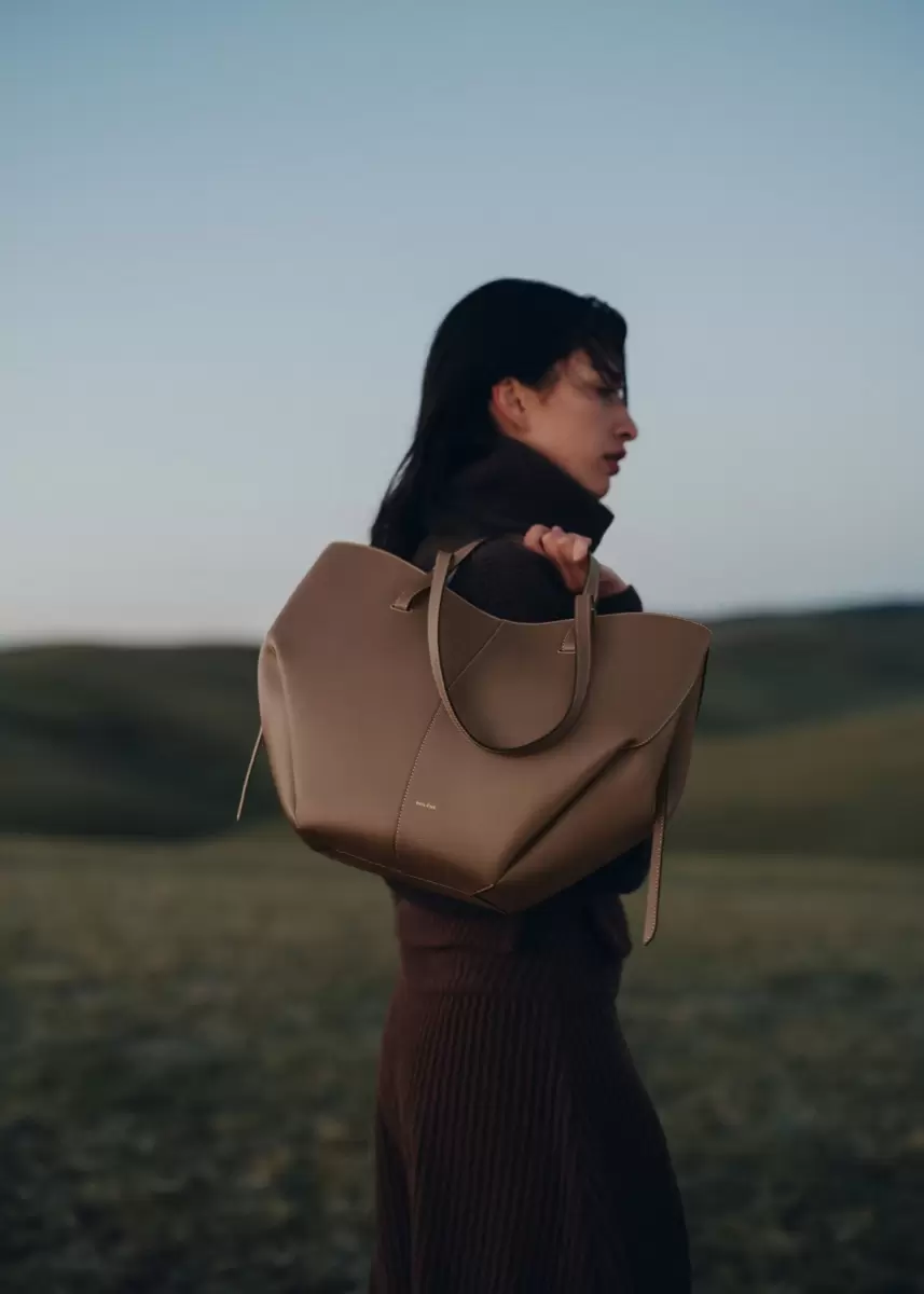 This sculptured tote bag featuring waves, folds, and curves can be used in two ways. Basket-style, with its sides open and straps on the outside, or As a flower-like closed bag, with its sides tucked in and its straps crossed on the inside.