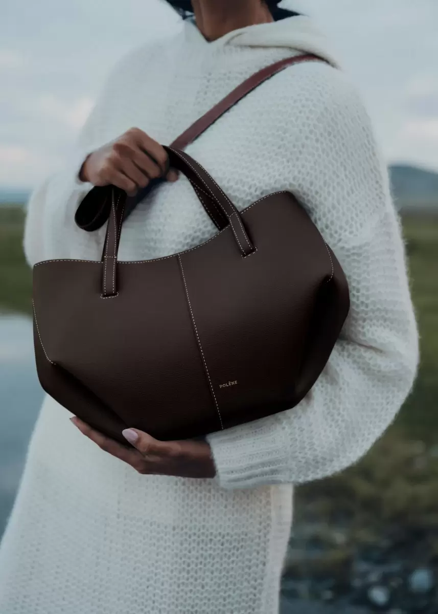This sculptured compact tote bag featuring waves, folds, and curves can be used in two ways. Basket-style, with its sides open and straps on the outside, or As a flower-like closed bag, with its sides tucked in and its straps crossed on the inside.