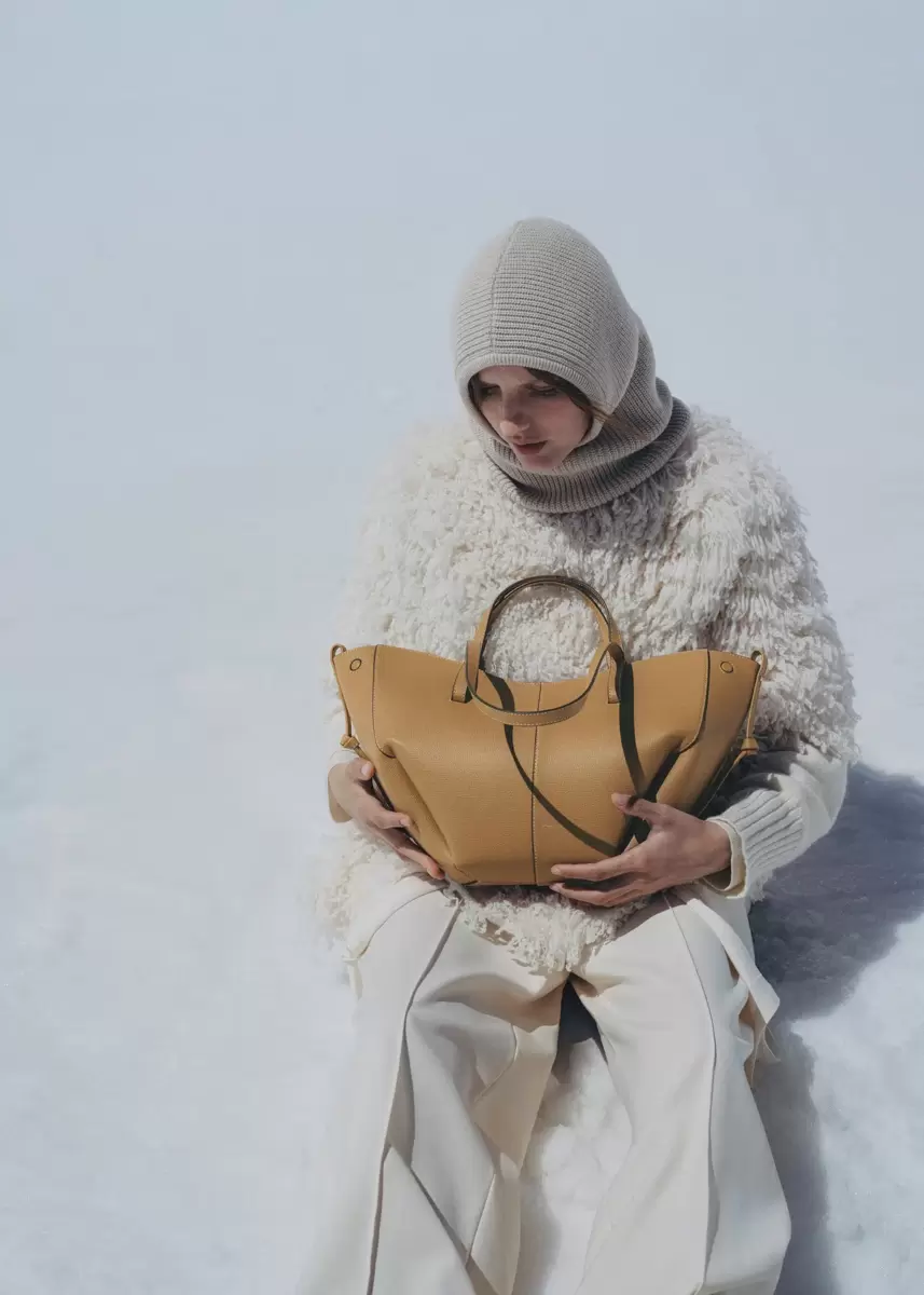 This sculptured compact tote bag featuring waves, folds, and curves can be used in two ways. Basket-style, with its sides open and straps on the outside, or As a flower-like closed bag, with its sides tucked in and its straps crossed on the inside.