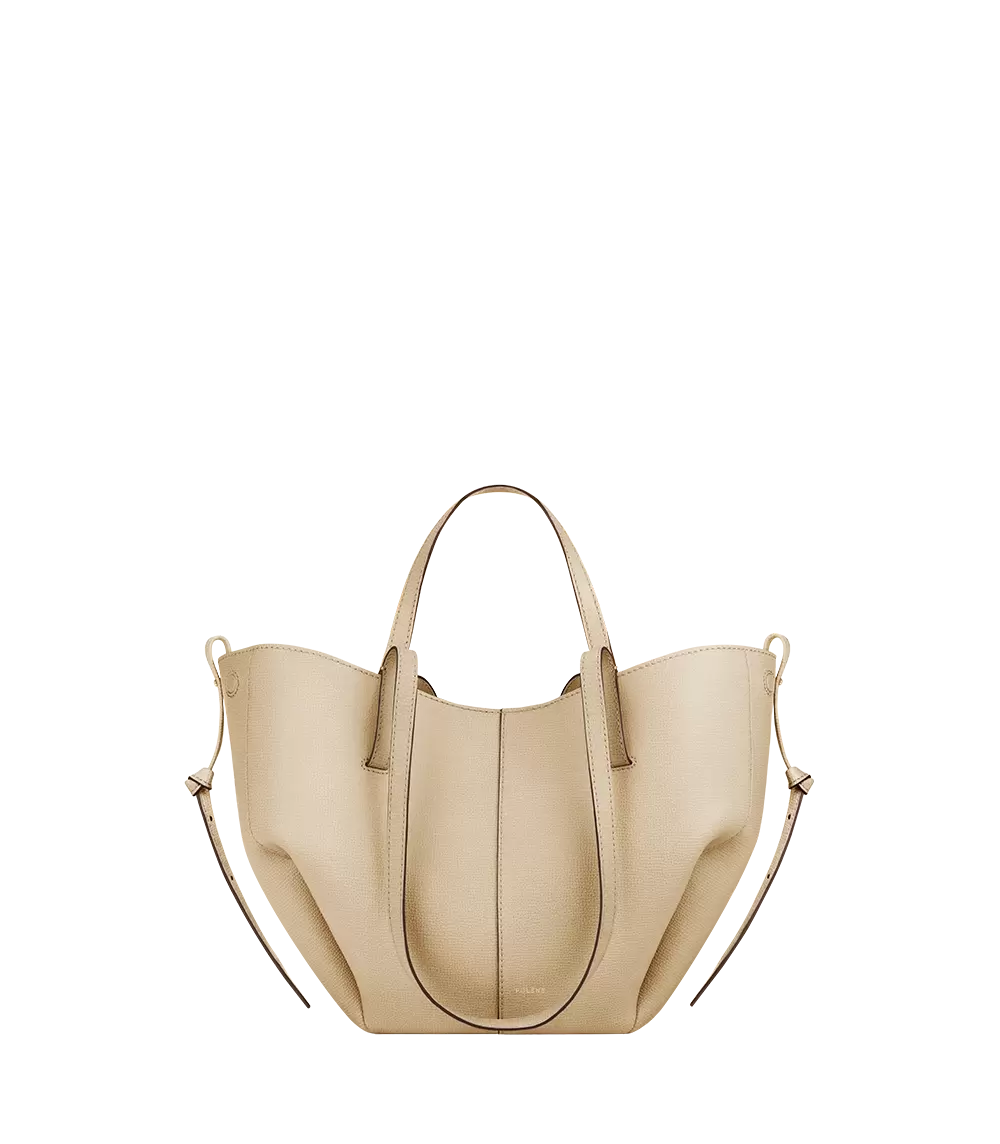 This sculptured compact tote bag featuring waves, folds, and curves can be used in two ways. Basket-style, with its sides open and straps on the outside, or As a flower-like closed bag, with its sides tucked in and its straps crossed on the inside.