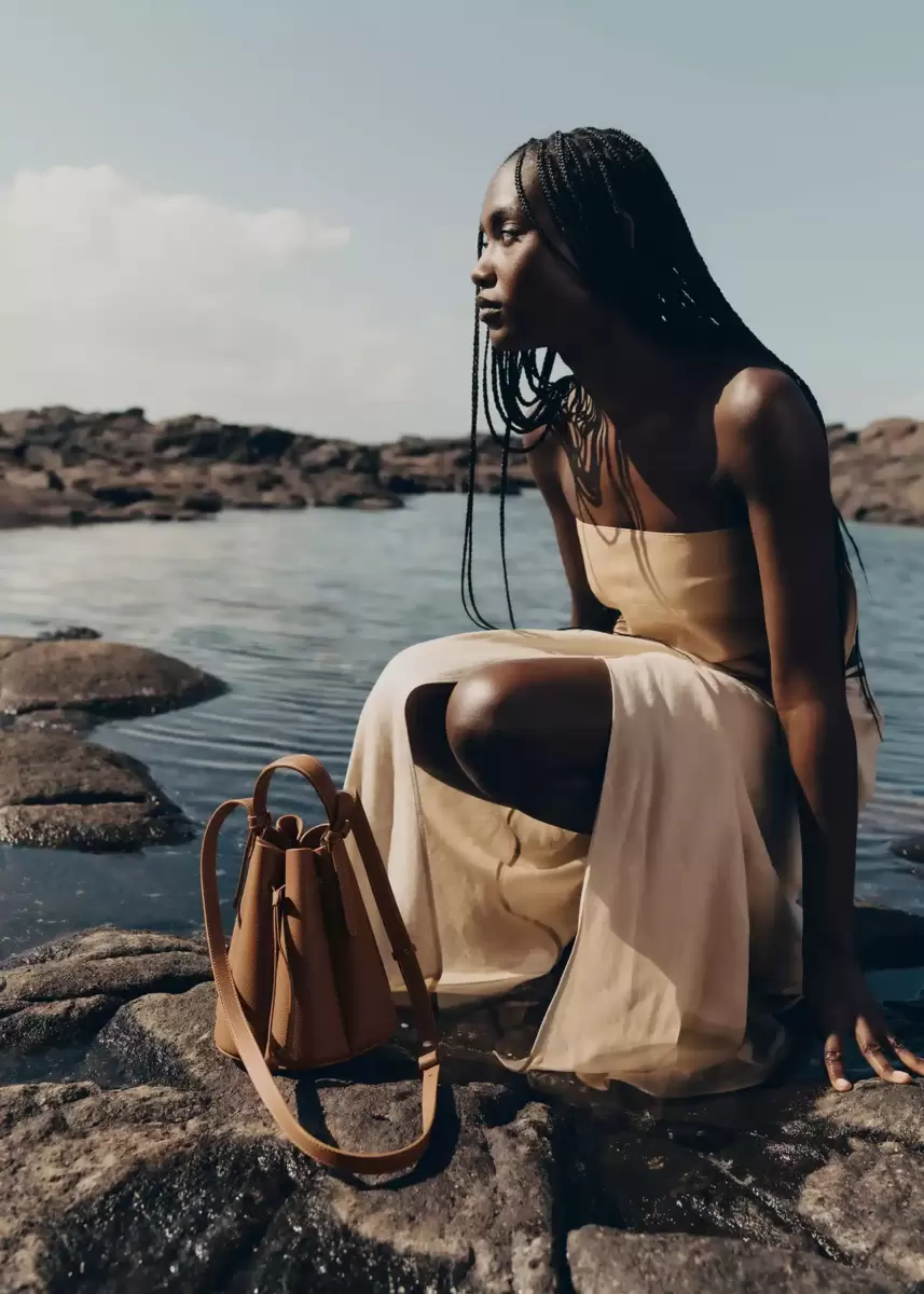 The “Numéro Huit Mini” is a compact, flower-like bucket bag. Its sculptural lines are obtained using waves of leather to create a fluted look.