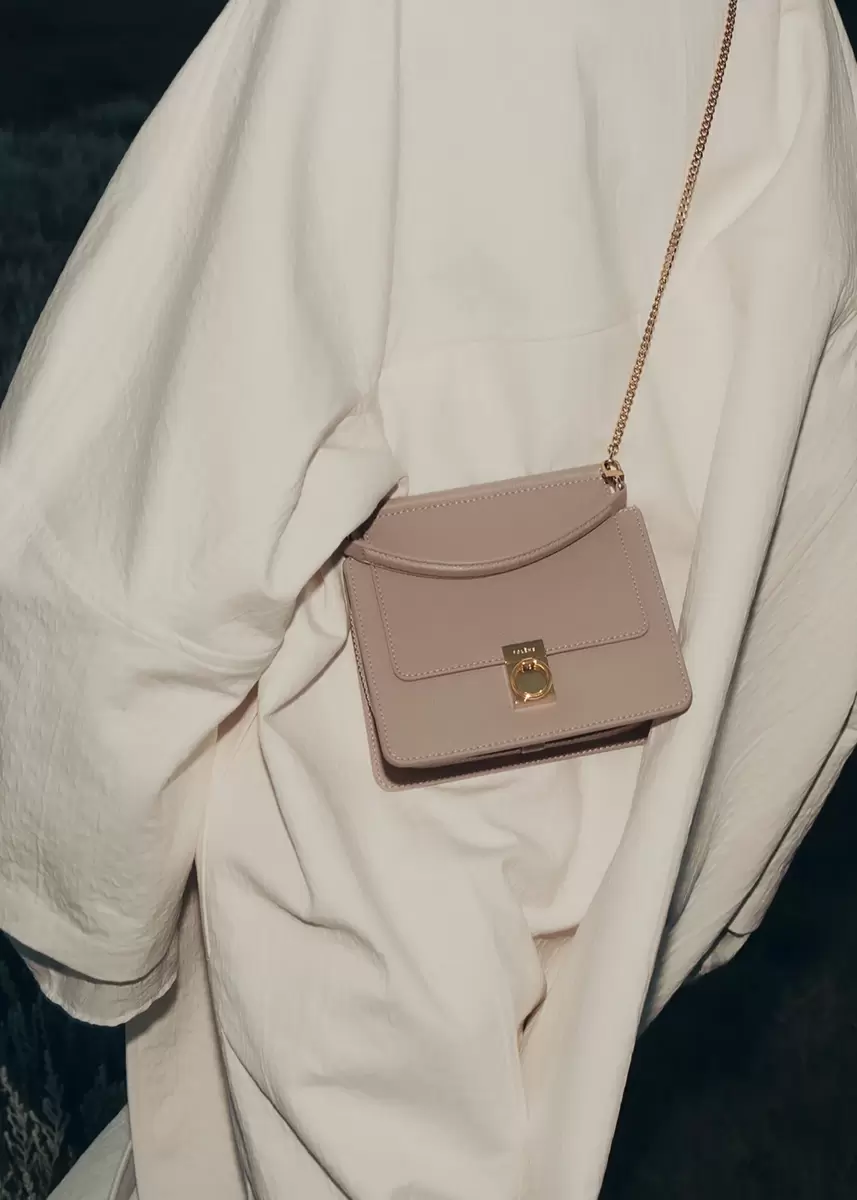 The “Numéro Sept Mini” is a structured bag that combines leather and meticulous jewelry work with its signature clasp, Polène-engraved snap hooks, and chain shoulder strap.