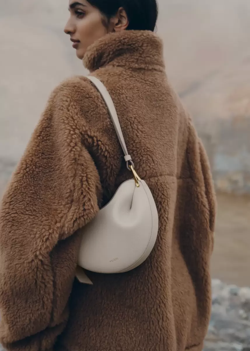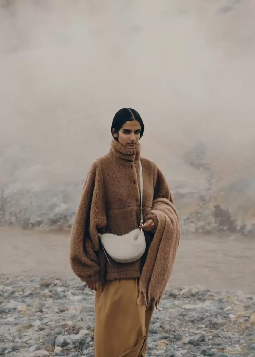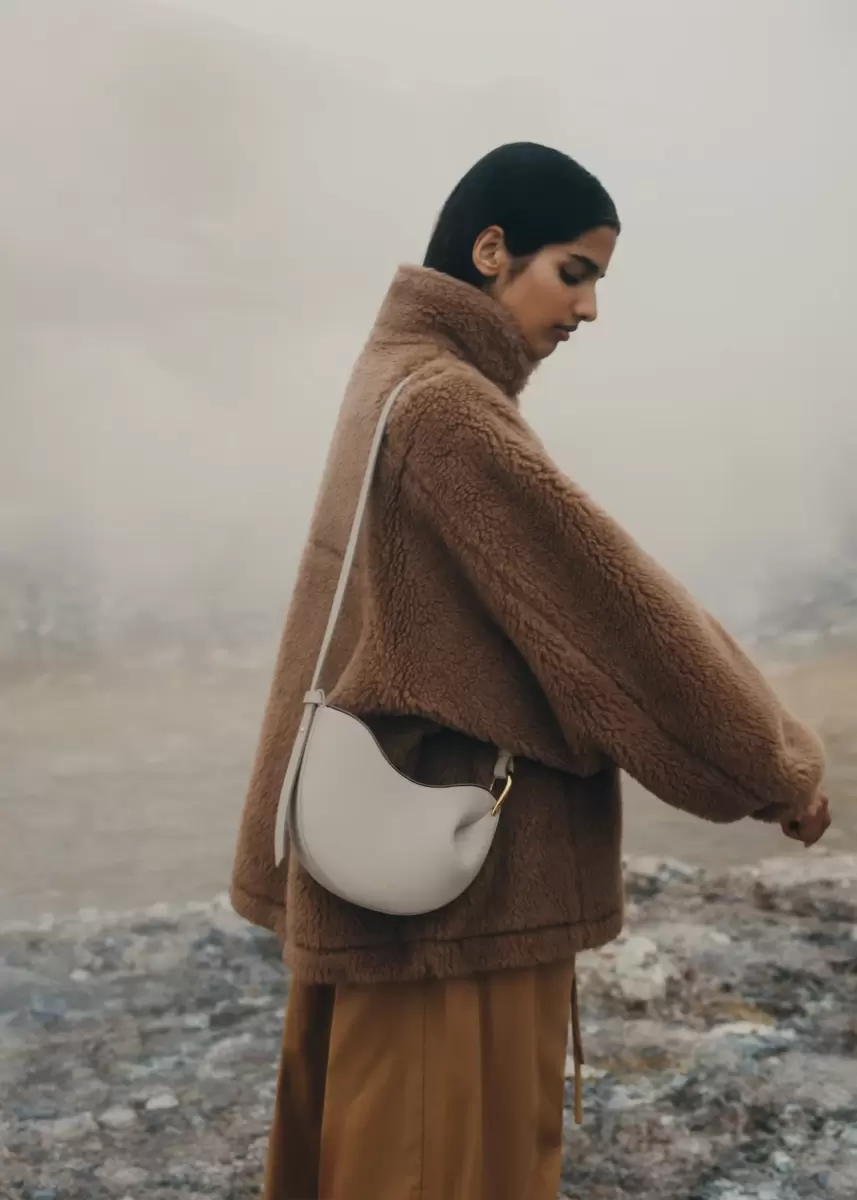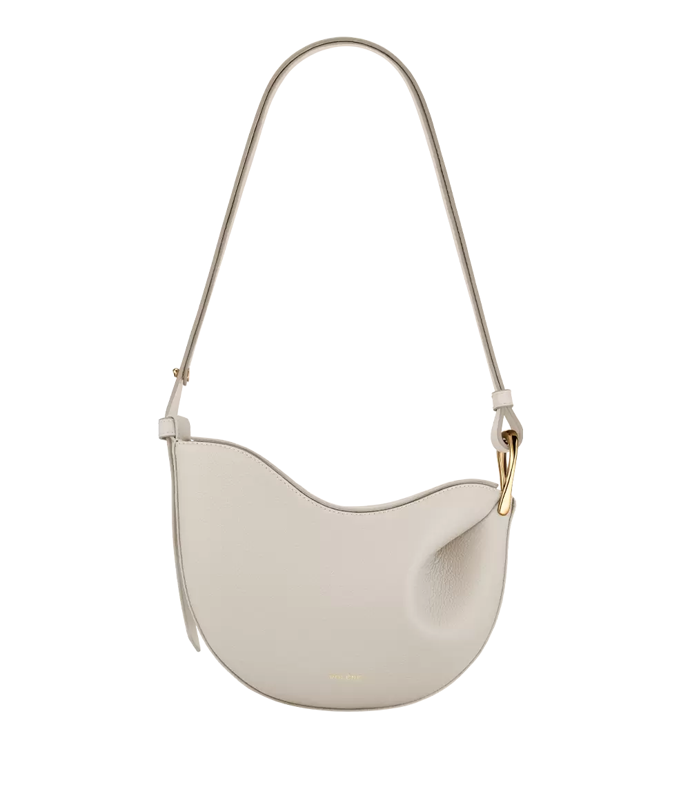 Obtained by modeling the leather on a wooden mould, the “Tonca” bag’s roundness is shaped by its folds that blend into a twisted metal buckle. The bag’s contrasting body and shoulder strap feature smooth and textured leathers.