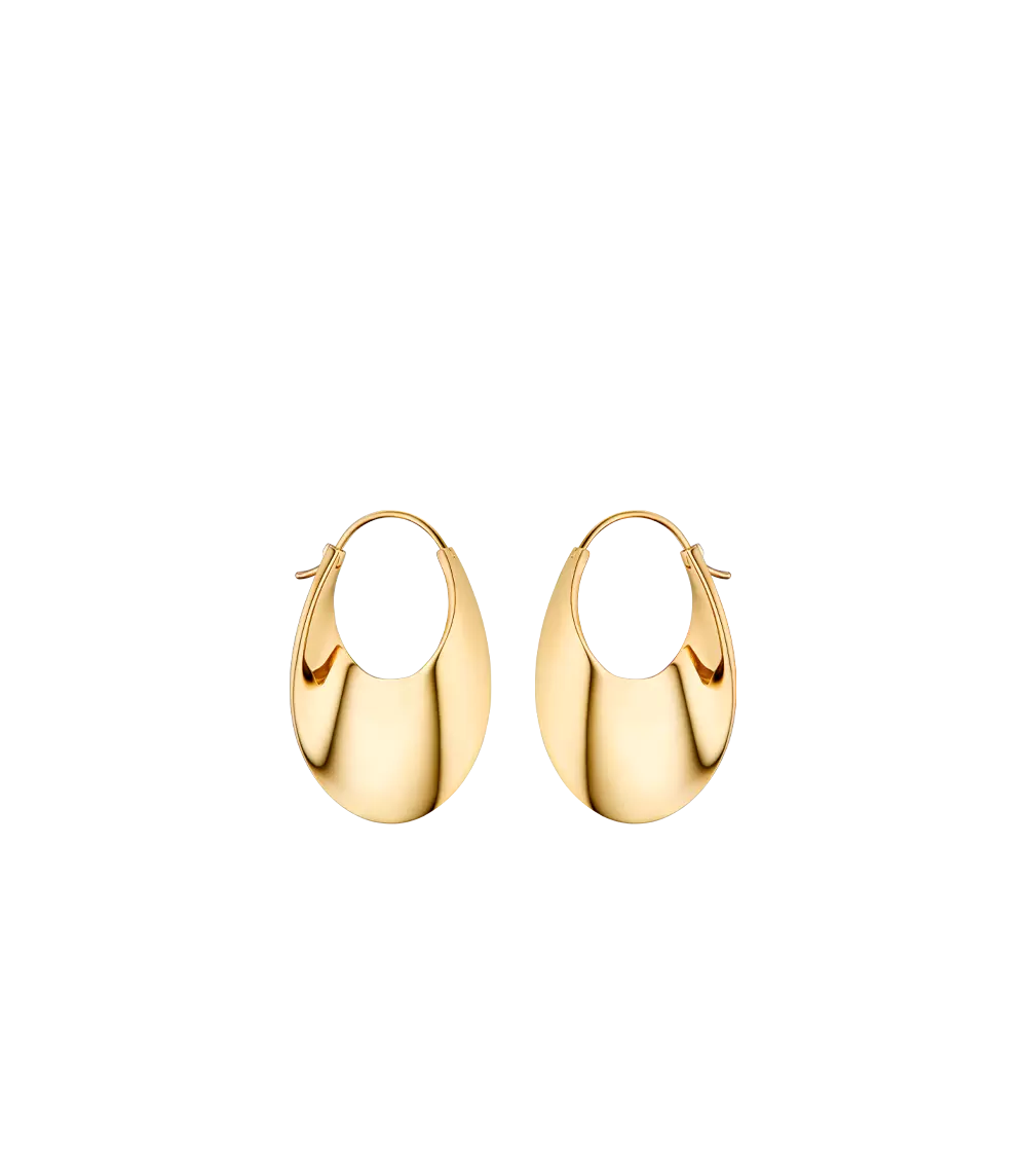 - A sculptural reworking of the hoop earring with a long, solid shape.