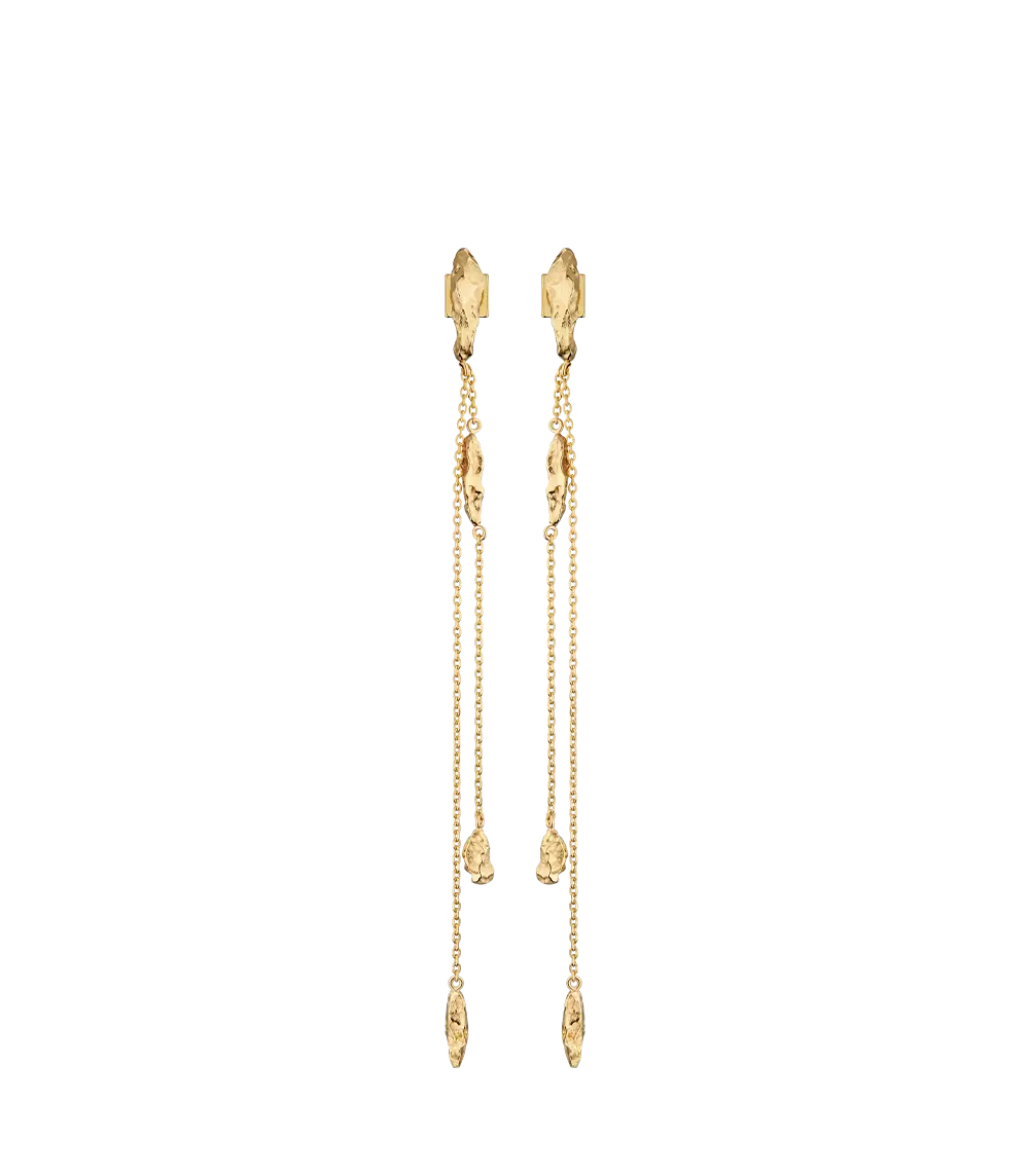 These Eroz chain earrings feature delicate loops adorned with golden nuggets. A perfect harmony of lightness and fluidity with a rough, stonelike texture.