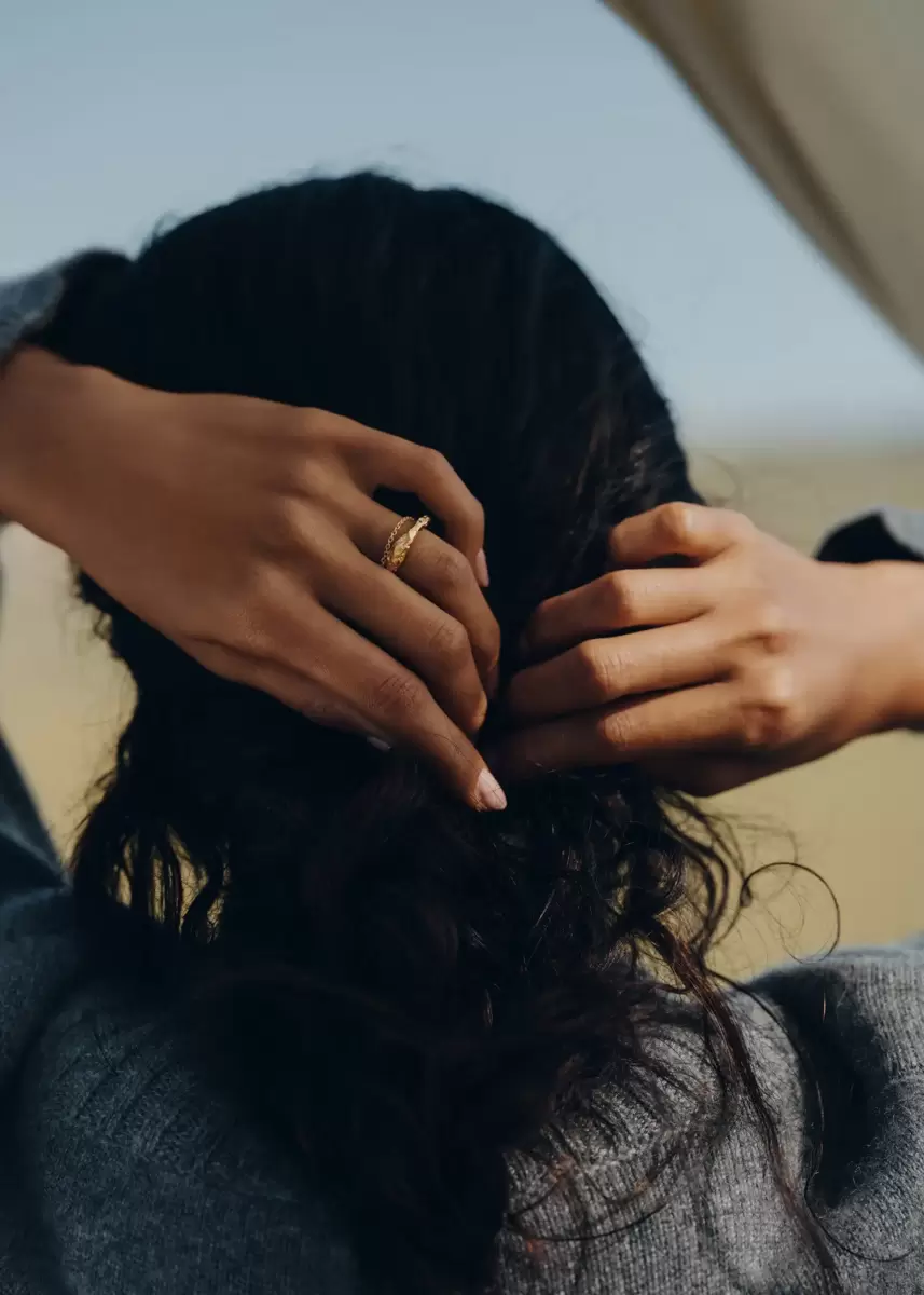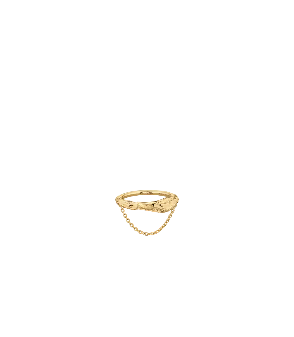 The Eroz chain ring combines rough and smooth textures with a thin, delicate chain that falls gracefully onto the finger.