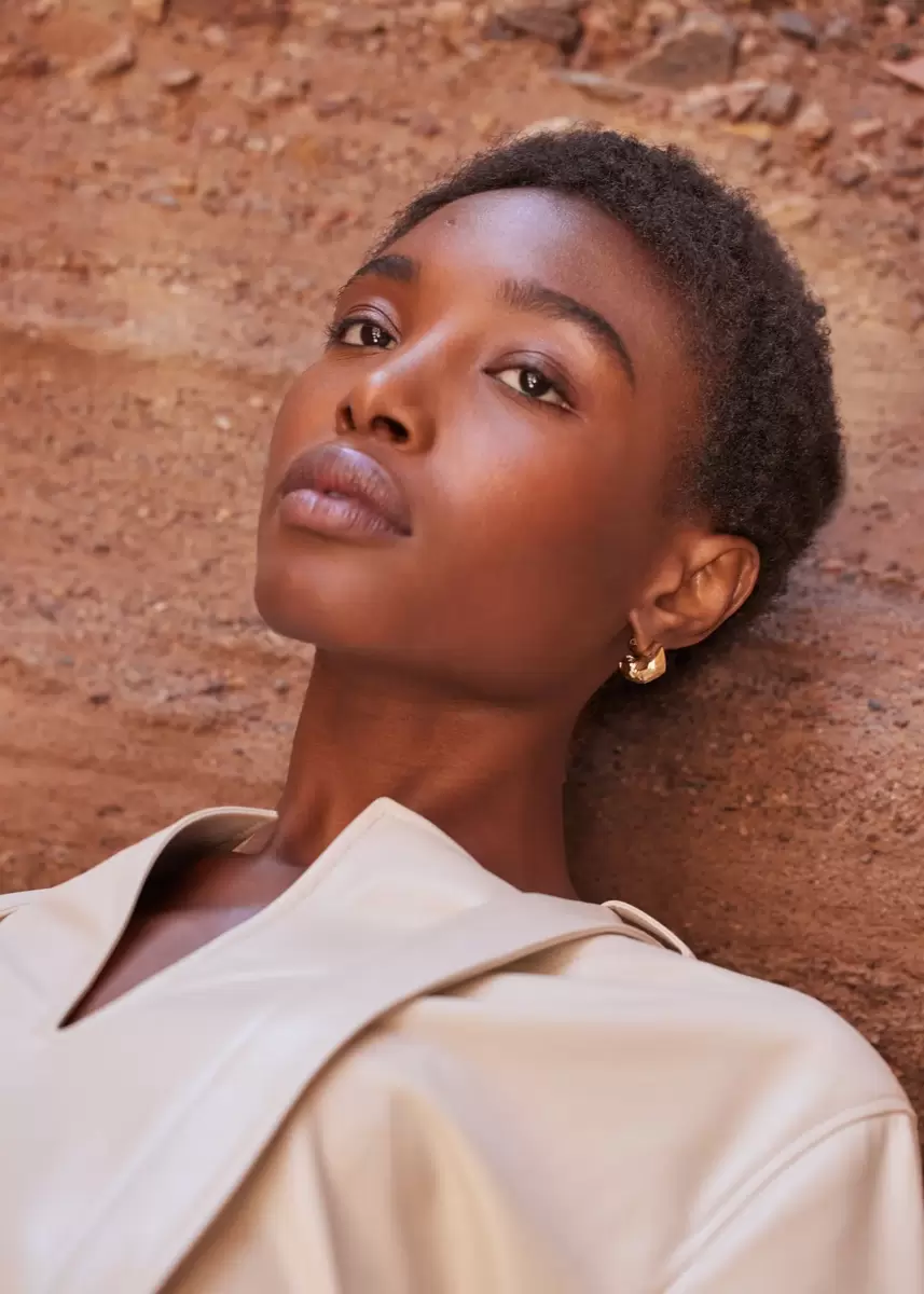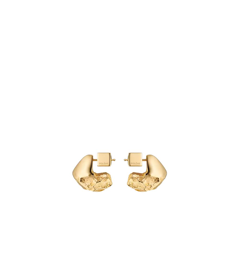 Mini earrings with a strong look and a bold shape. The texture seamlessly evolves from a polished appearance to a rocky look.