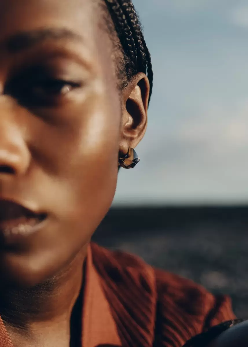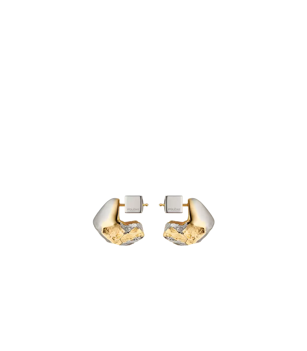 Mini earrings with a strong look and a bold shape. The texture seamlessly evolves from a polished appearance to a rocky look. This edition combines the silvery hue of palladium with the delicate sparkle of 24-carat gold.