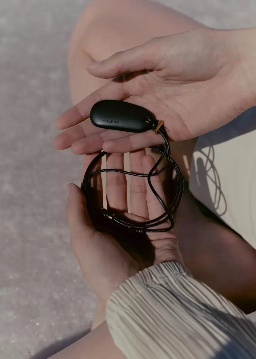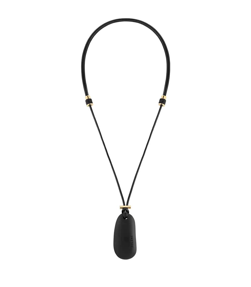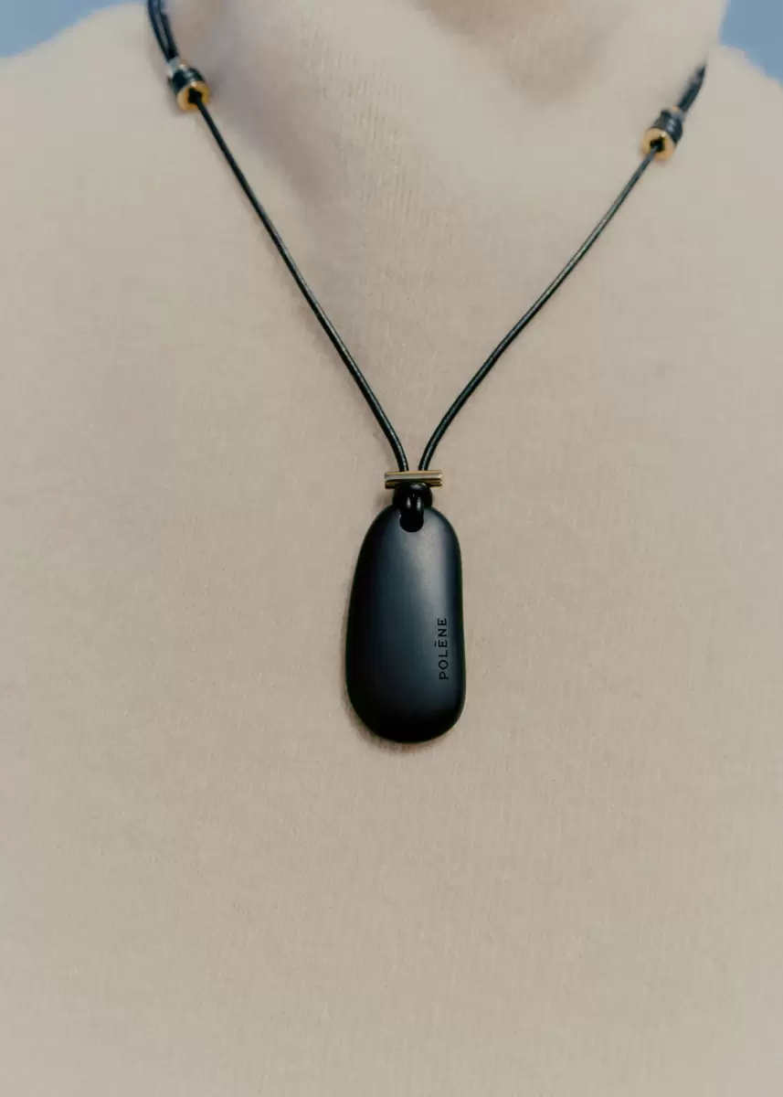 The Téré pendant adopts the organic shape of a beach pebble carved from black marble. The hand-polished stone is secured by delicate leather cording.